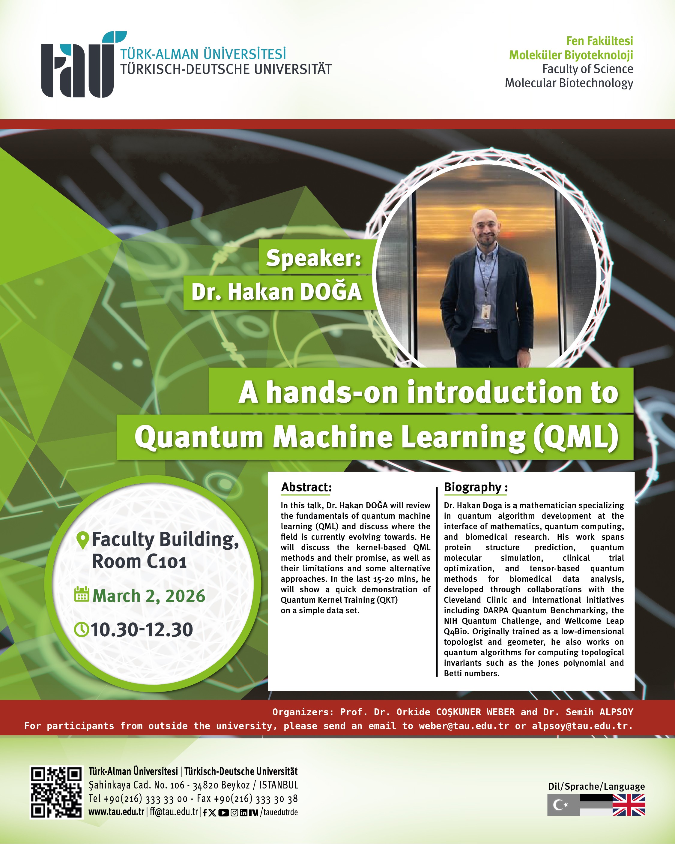 Dr. Hakan DOĞA tarafından “Kuantum Makine Öğrenimine Uygulamalı Bir Giriş (QML)” başlıklı bir çalıştay gerçekleştirilecektir. Çalıştayda kuantum makine öğrenmesinin (QML) temel kavramları ele alınacak ve alanın güncel gelişim yönleri değerlendirilecektir. Kernel tabanlı QML yöntemlerinin potansiyeli ve sınırlılıkları tartışılacak, ayrıca alternatif yaklaşımlara değinilecektir. Programın son 15–20 dakikasında ise basit bir veri seti üzerinde Quantum Kernel Training (QKT) uygulamasına yönelik kısa bir gösterim yapılacaktır.